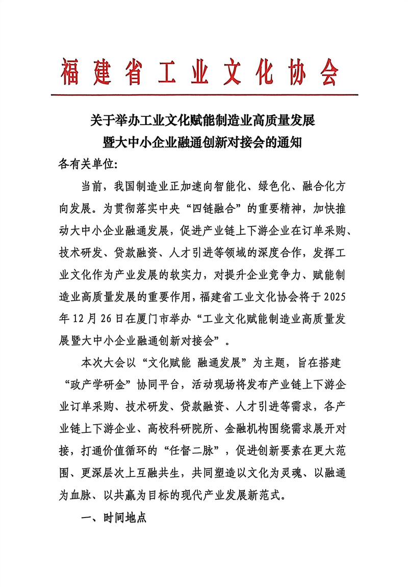 关于举办工业文化赋能制造业高质量发展 暨大中小企业融通创新对接会的通知