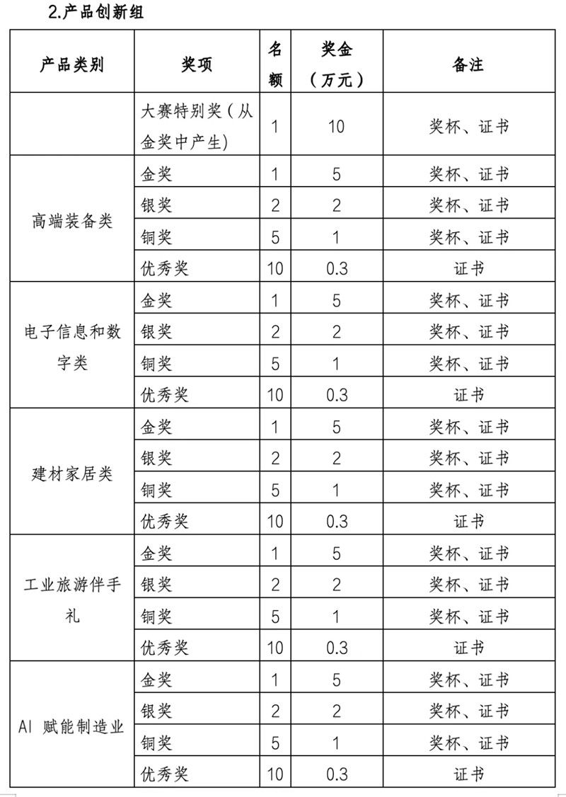 1.综合赛:分为设计创意组和产品创新组两大组别。设计创意组以面向院校为主,所报作品及方案要以引导市场消费升级为导向,能引导或迎合消费新需求的前瞻性创意概念。产品创新组以面向企业为主,产品须为近两年(即2023年8月1日起至2025年8月31日止)已上市销售或已量产的产品。